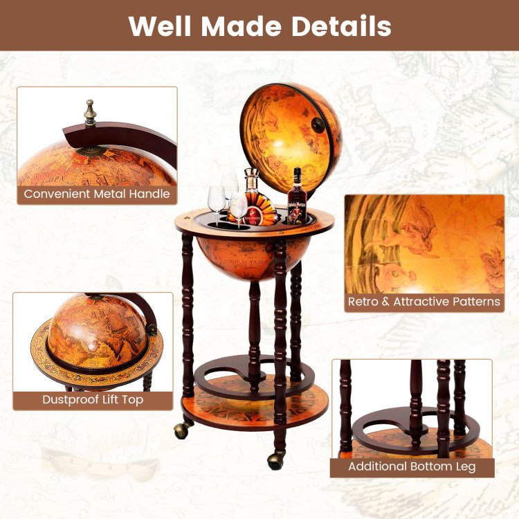 1.Robust and Durable Structure: This globe bar is made of solid wood. Thanks to the high-quality materials and good workmanship, the minibar is very robust and durable. The three supports under the ball ensure the stability of the globe bar.