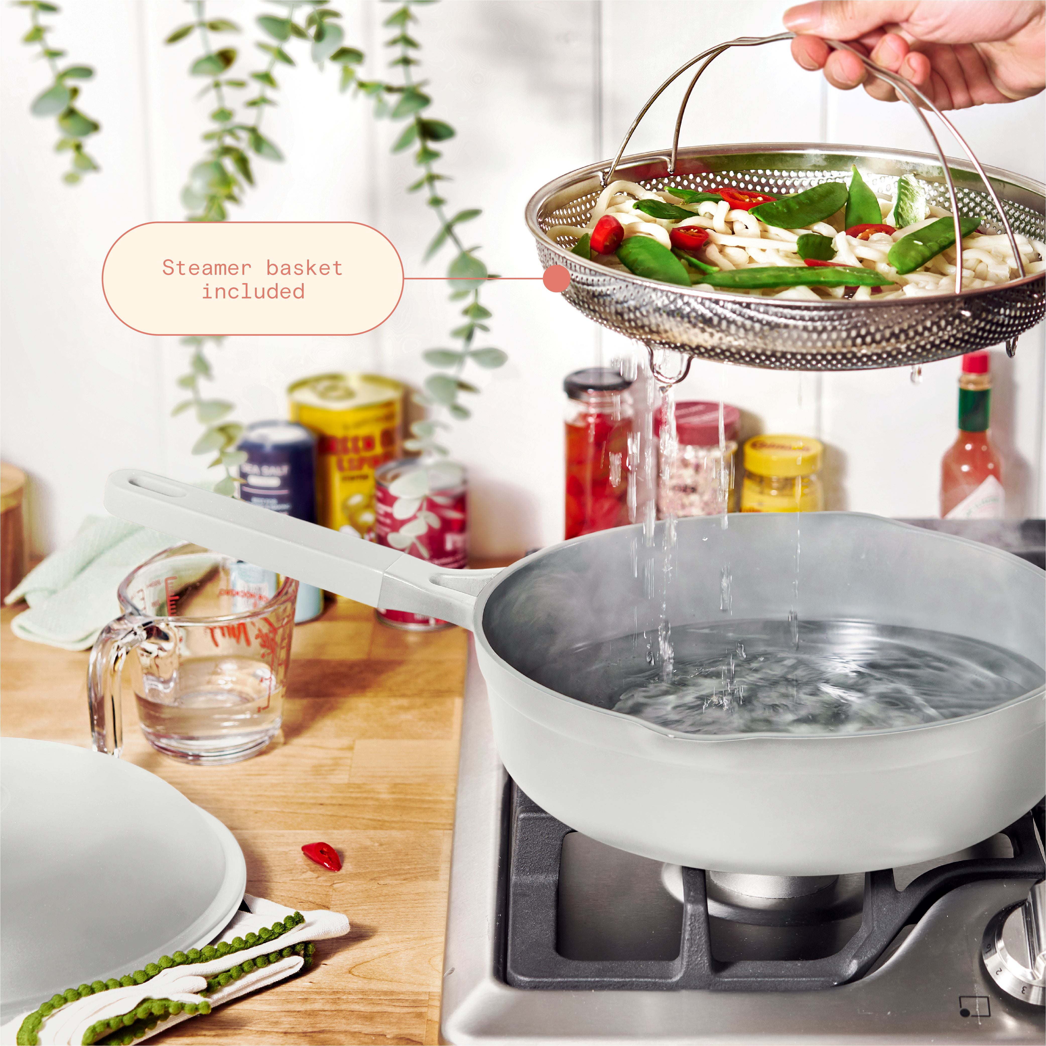 10 Cooking Functions: Boil, Strain, Sauté, Simmer, Pan Fry, Sear, Braise, Steam, Stir Fry, and Serve Free from forever chemicals, ceramic nonstick coating is PTFE, PFOA & PFOS free Durable cast aluminum construction 3 piece set, stainless steel steamer basket included Large 4qt capacity Two convenient pour spouts Compatible with all stovetops including induction Stainless lid knob with gold finish Stay cool comfort grip long handle Dishwasher safe, handwash recommended
