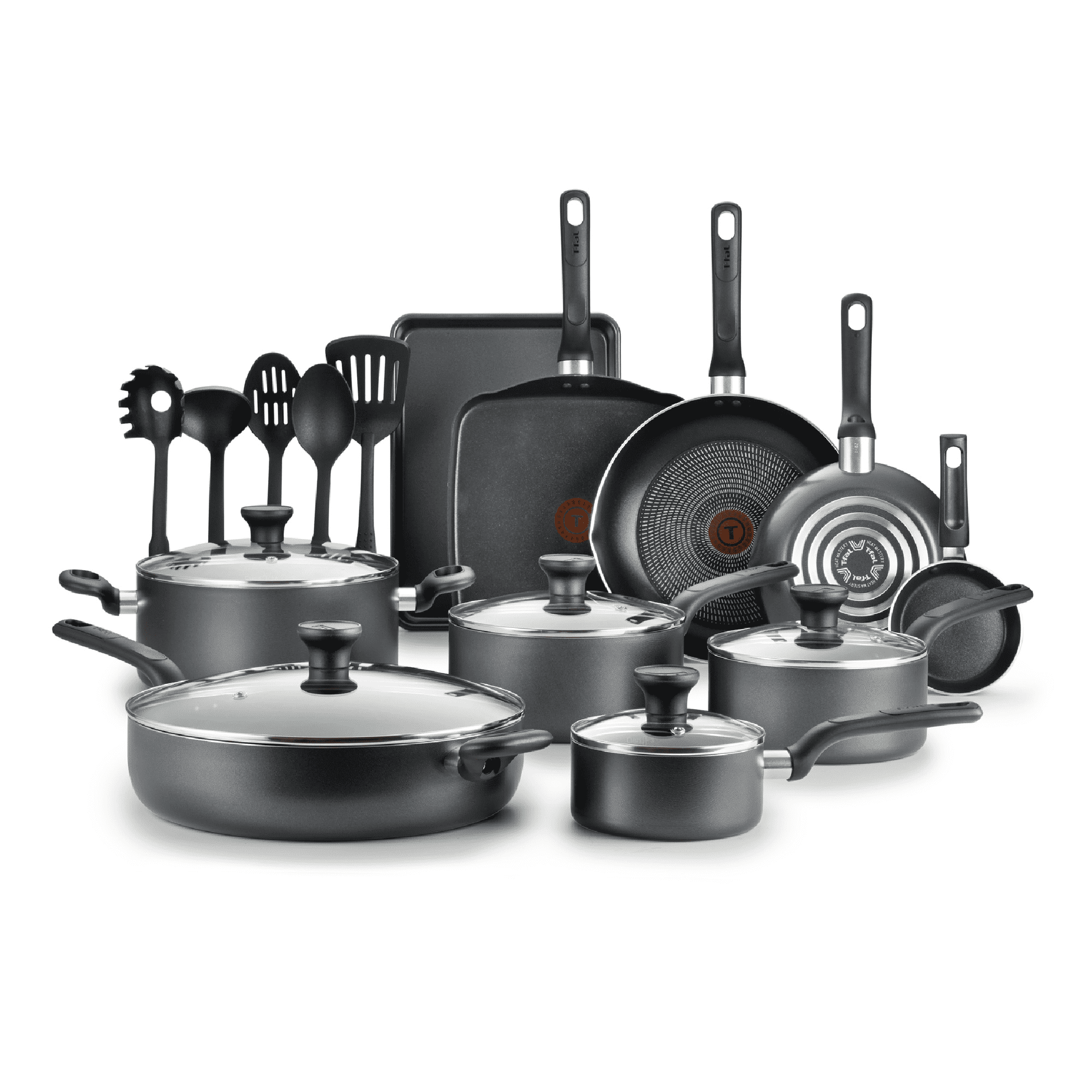 Ensuring reliable results when preparing meals for the whole family. Includes 4.5" One Egg Wonder, 8" fry pan with pouring spouts, 10.5" fry pan with pouring spouts, 10.25" griddle, 5QT jumbo cooker with glass lid, 1QT saucepan with glass lid, 2QT saucepan with glass lid, 3QT saucepan with glass lid, 5QT stewpot with glass lid, baking tray, pasta spatula, spatula, ladle, spoon, and slotted spoon.