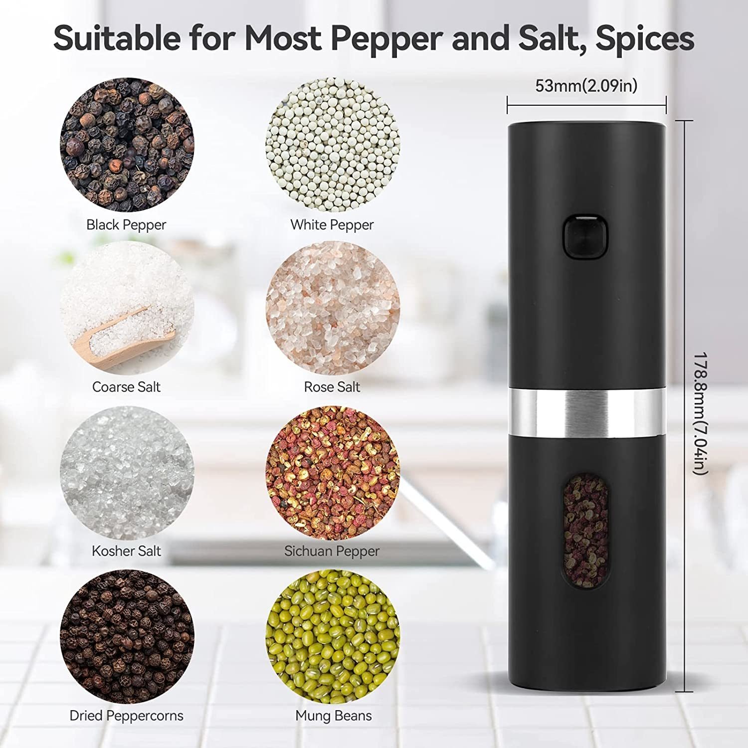 About this project[USB Charging and Battery Dual Use - Salt and Pepper Grinder Set]- This electric salt and pepper grinder set has a built-in rechargeable 1200mAh (4*300mAh) battery; just put the grinder on the charging base to charge it.