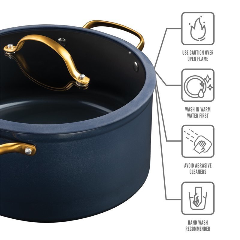 Nonstick 12-Piece Cookware Set, Gold is where culinary artistry meets effortless functionality. Elevate your cooking experience with this exquisite collection, meticulously crafted to meet the demands of both amateur enthusiasts and seasoned chefs. Indulge in the luxury of a flawlessly nonstick surface, expertly engineered to ensure your creations effortlessly slide off the pan. Whether it's sautéing delicate vegetables or searing succulent meats, our cookware guarantees an exceptional cooking performance every time. Each piece in this set is thoughtfully designed with versatility in mind. From the compact saucepans perfect for simmering delicate sauces, to the spacious stockpot ideal for crafting savory stews, our cookware collection empowers you to conquer any culinary endeavor. Crafted with durability at its core, this cookware set is built to withstand the test of time. The heavy-gauge aluminum construction ensures even heat distribution, eliminating hotspots that could compromise your masterpiece. For product's longevity, please hand wash in warm water with a soft sponge.Non-Stick 12-Piece Cookware Set, GoldTriple layer, NonstickGreat for all cooktopsMade without PFOA or PFOSDesigned for fast cooking